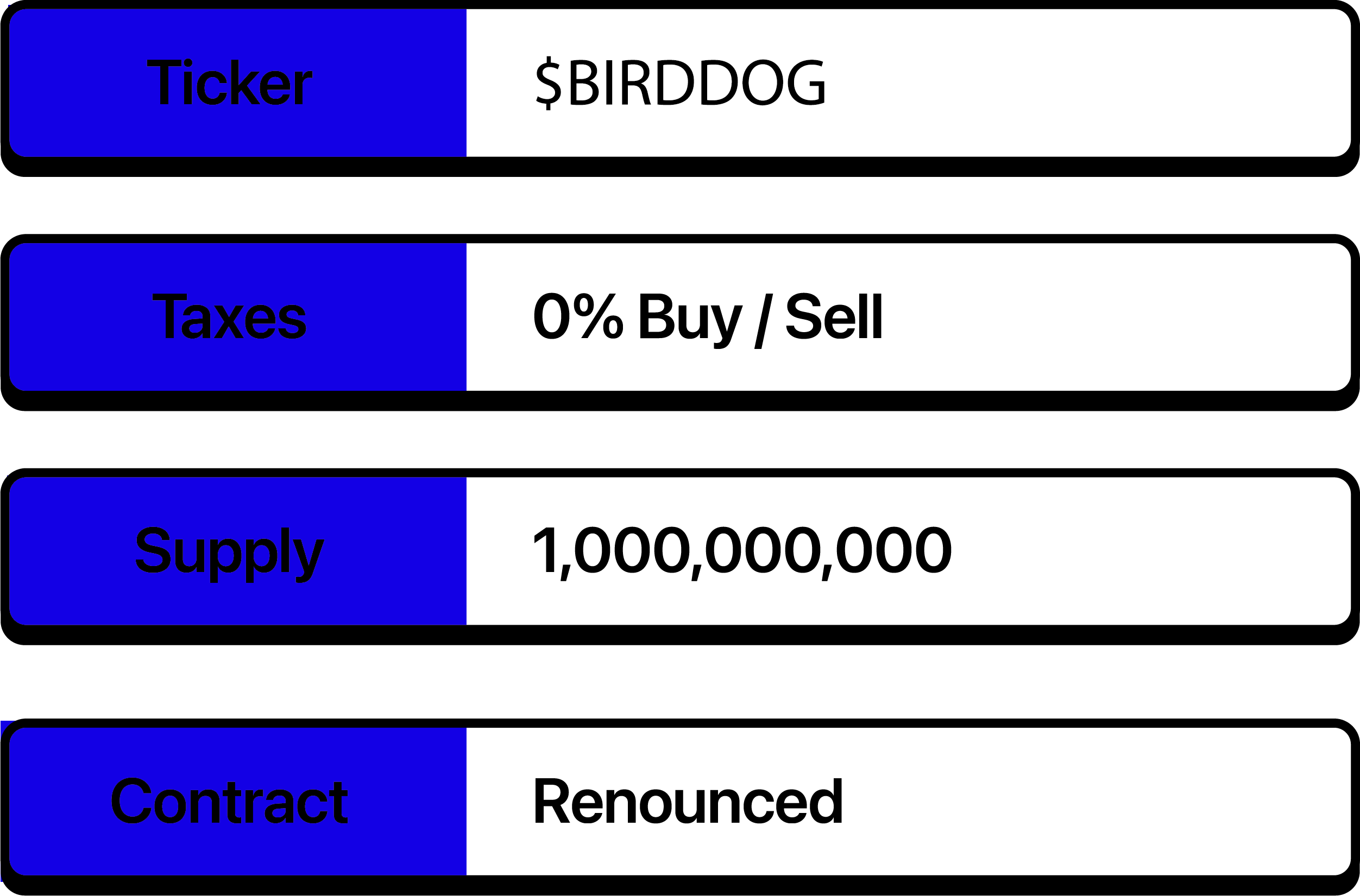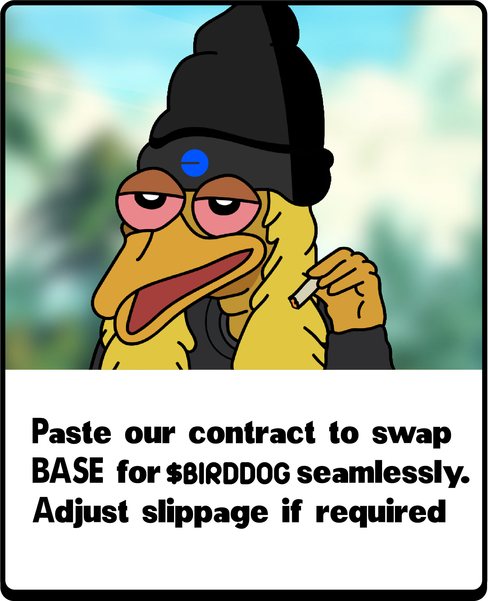 Bird-Dog has crashed in, feathers ruffled, fur flying, and ready to deliver way more than just piping-hot slices. As the wisecracking bastard of Matt Furie’s wild boys’ club, Bird-Dog’s here to bring back raw, unfiltered memes with a side of filthy gains for the chads ready to get back to memes. Locked and loaded on BASE, this legend isn’t just slinging pizzas—he’s the last member to send it straight to the moon.